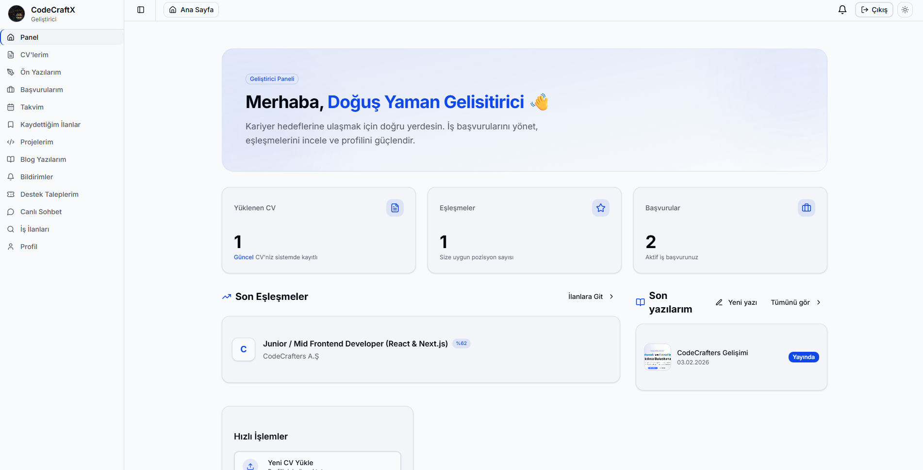 CodeCraftX işveren dashboard görünümü
